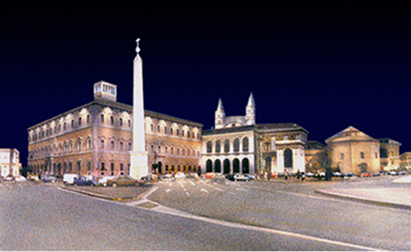 b. Nelle piazze cui fanno capo i rettilinei la distribuzione dei flussi luminosi e quindi delle luminanze privilegia le facciate degli edifici e i monumenti che vi si prospettano rispetto al piano di calpestio. Così le superfici verticali dei palazzi possono ricreare la dimensione dell’ambiente cancellata dal buio e preparare la scenografia dei fondali. Gli aggetti, le modanature, acquistano rilievo e plasticità.