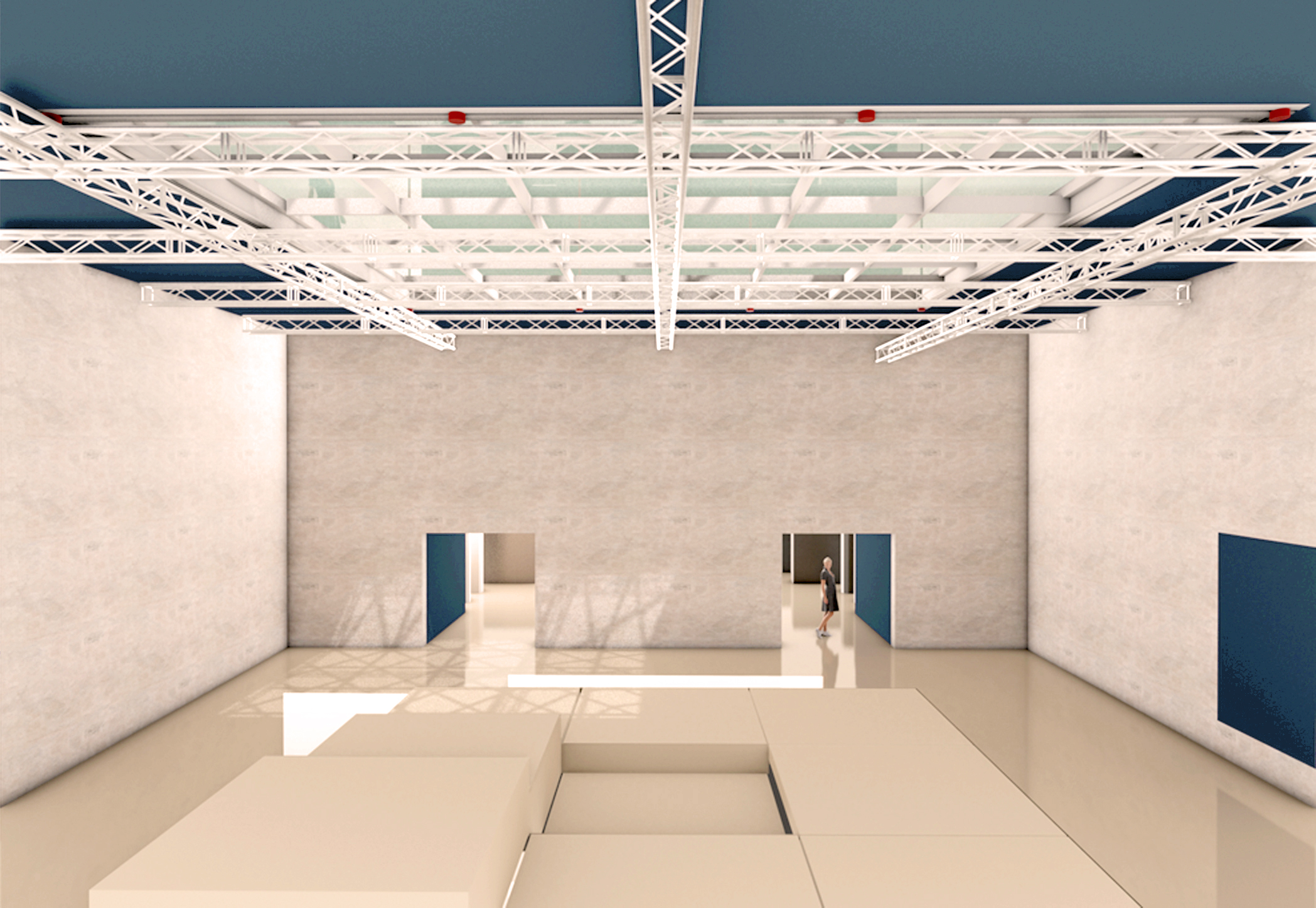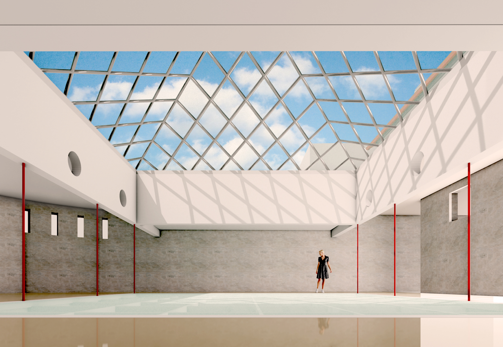 un vasto ambiente vuoto, illuminato da un lucernario a piramide, anche oscurabile, divisibile per ottenere laboratori, studi, uffici, spazi di lavoro