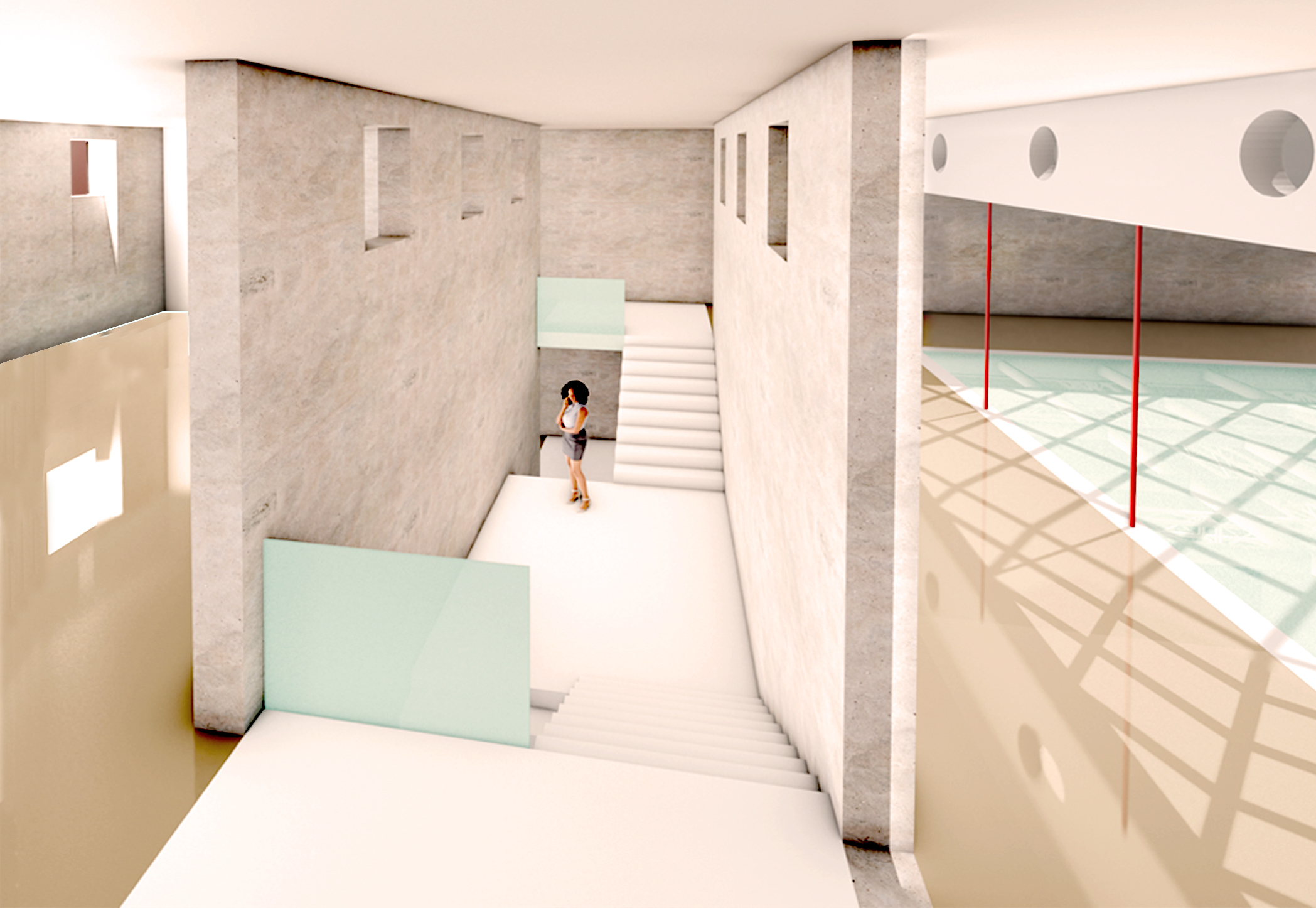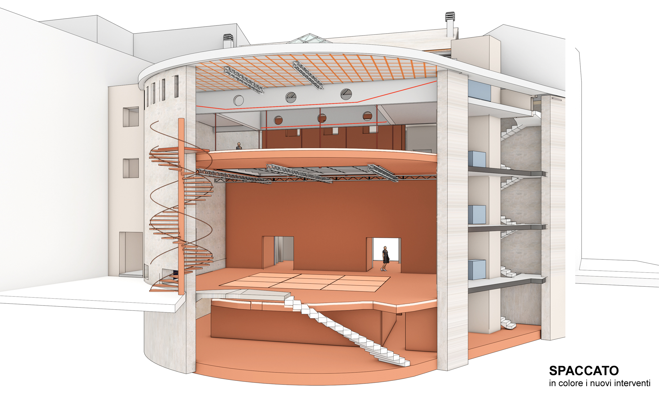 Dell'edificio esistente si demolisce la platea e la galleria; si svuota il piano interrato, si mantiene l'atrio di ingresso attualizzandolo con il colore e giochi di luci.
